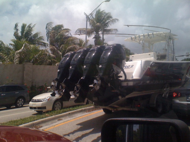 “I think this satisfies both areas, and this was a difficult situation to photograph from my car but. First of all this guy is a bag of dicks for owning a boat with four 225 horsepower outboard engines. Obviously going through life with complete disregard for his carbon footprint. He is also blocking traffic. The reason he is blocking traffic is because he has just gotten himself into a car accident dragging his overcompensating pleasure vessel with his equally overcompensating ford excursion probably trying to pull into the drive-thru in front of Joey… Rich people problems.”